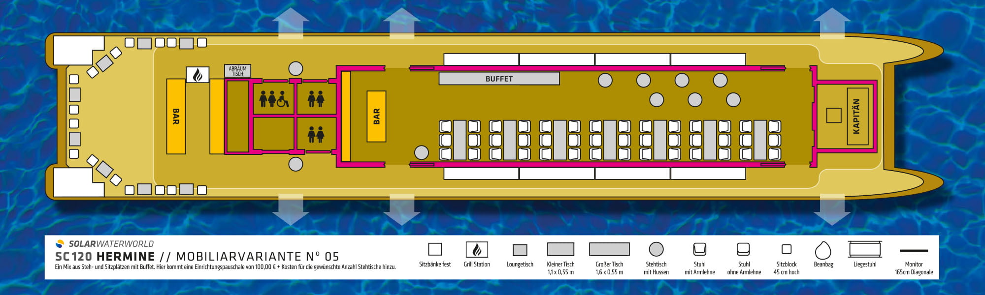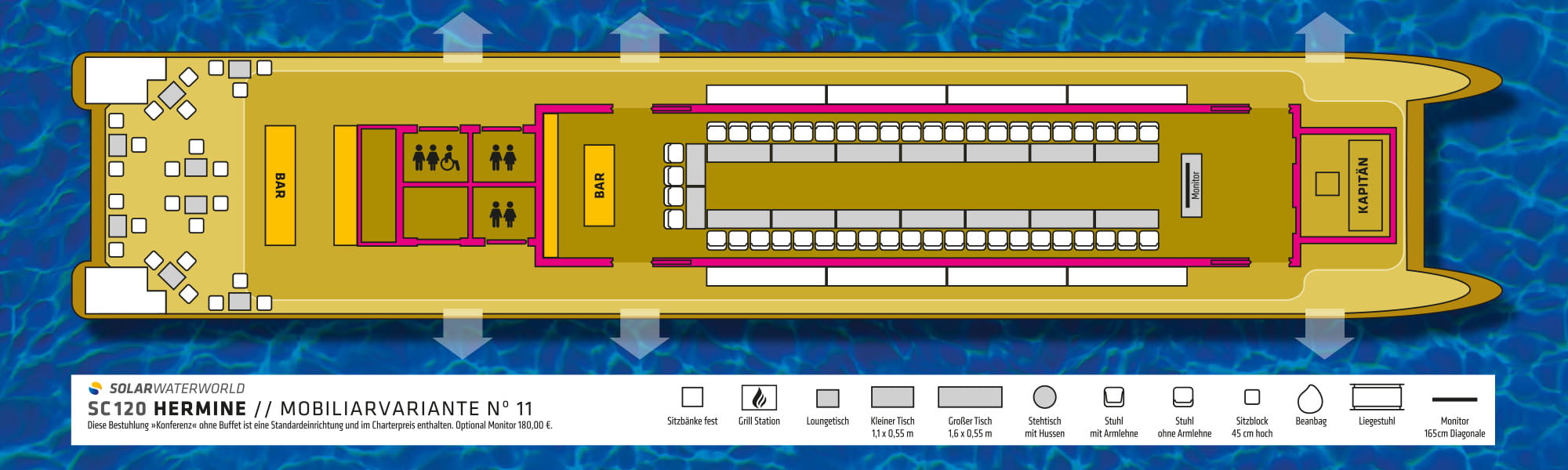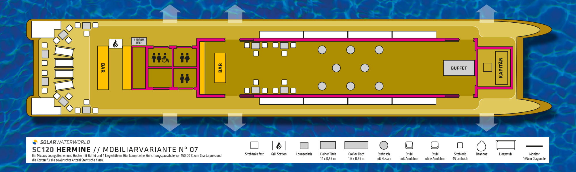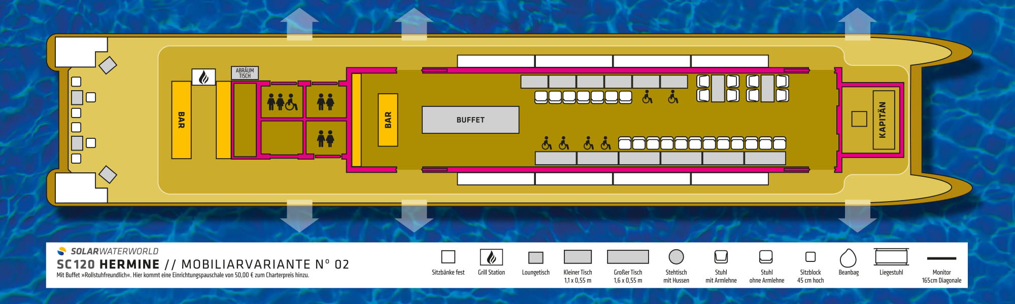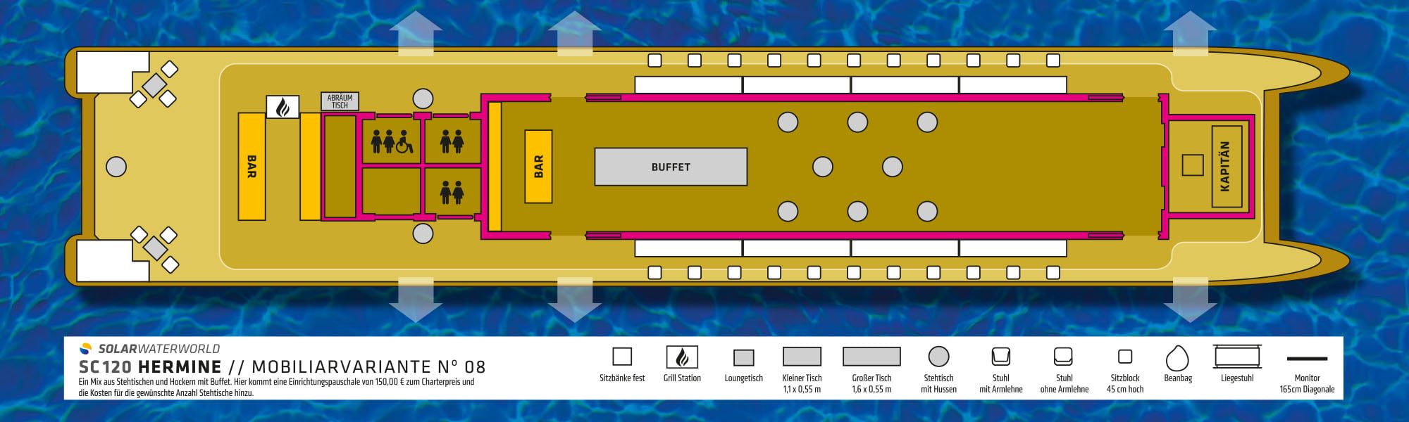 Die SunCat 120 „Hermine“ ist seit 2020 das modernste Schiff in Berlin. Modern nicht nur in Bezug auf seine klimaneutrale Antriebstechnik, sondern auch in Bezug auf seine Ausstattung.