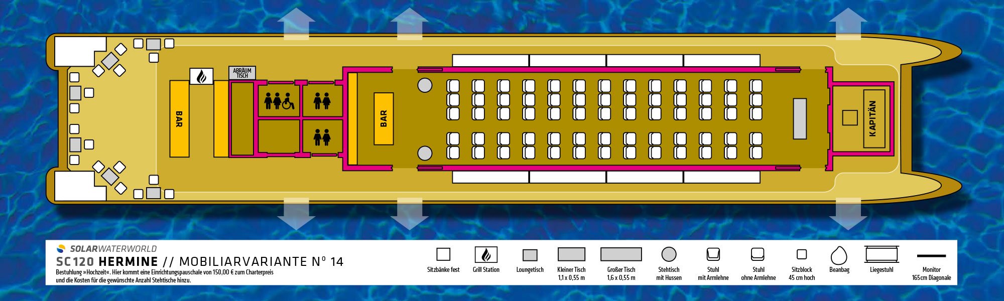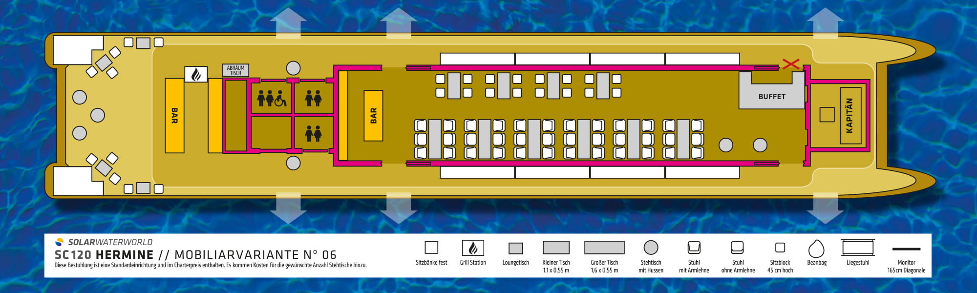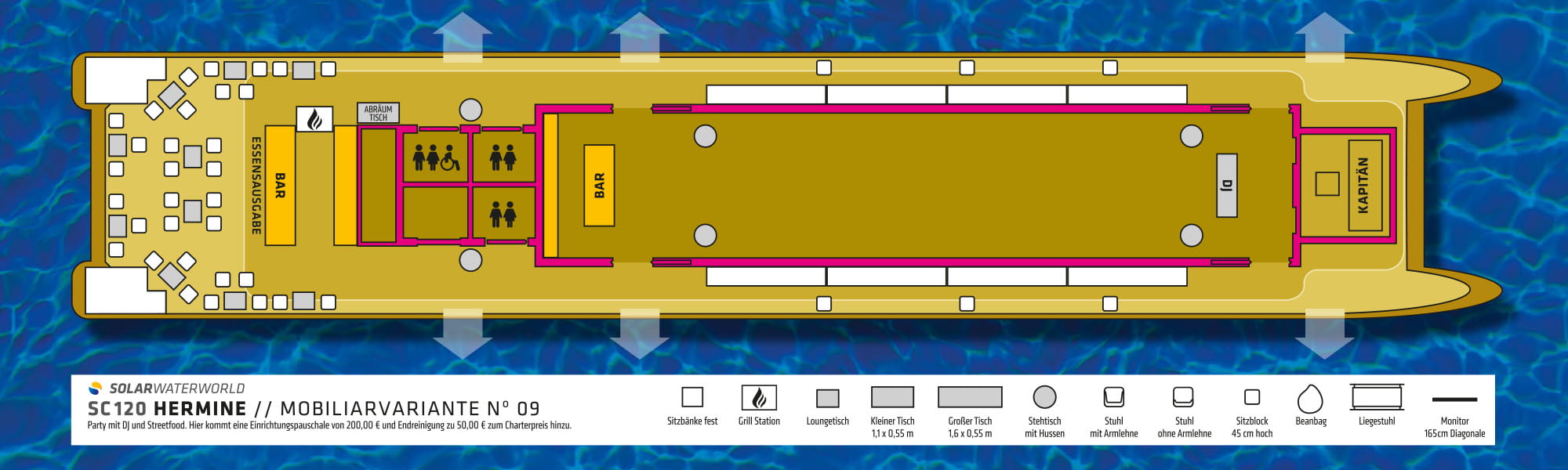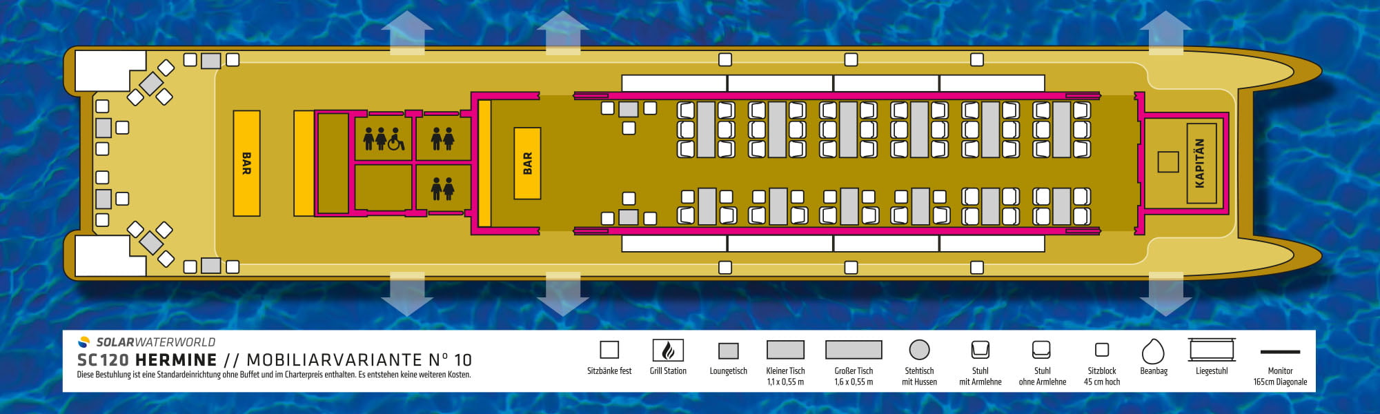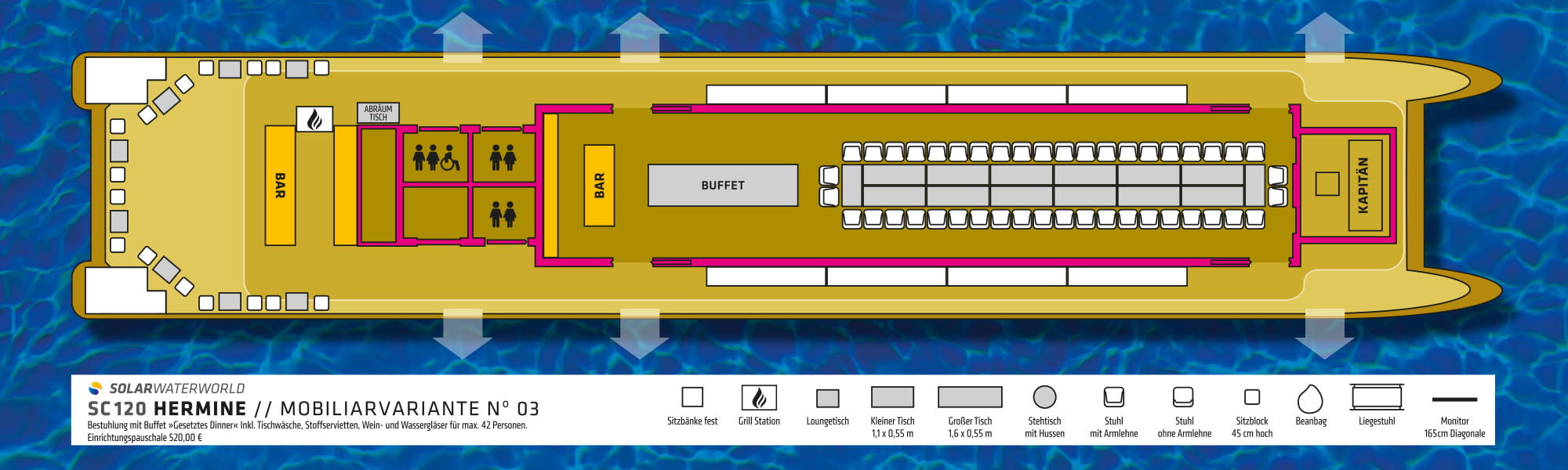 Die SunCat 120 „Hermine“ ist seit 2020 das modernste Schiff in Berlin. Modern nicht nur in Bezug auf seine klimaneutrale Antriebstechnik, sondern auch in Bezug auf seine Ausstattung.