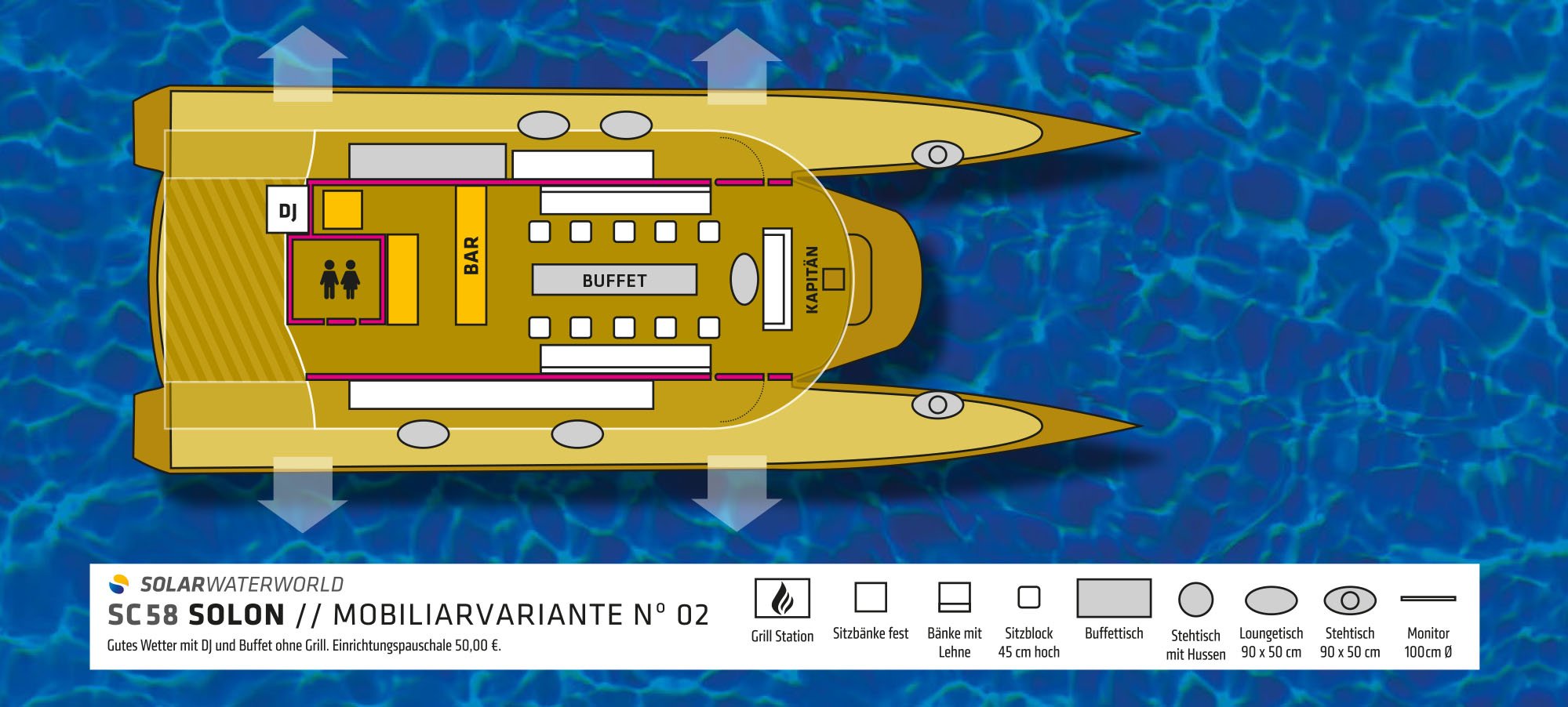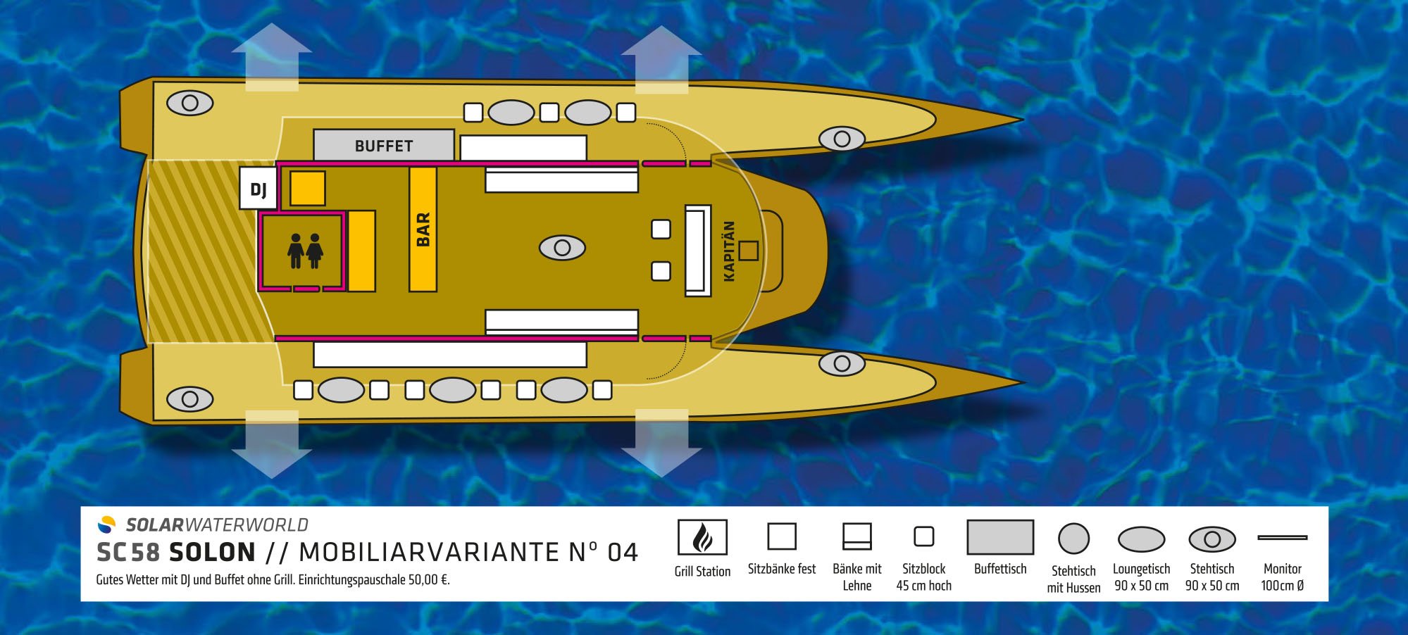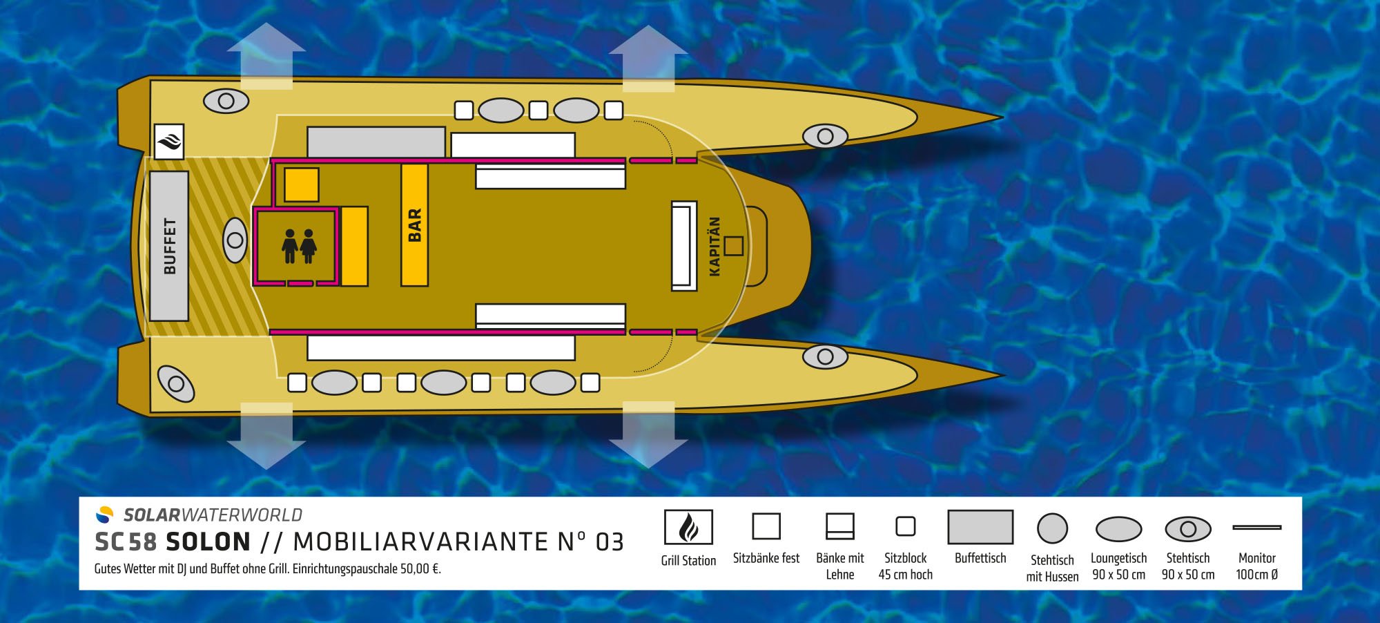 Die „Solon“ ist ein reines Charterschiff und kann zu jedem beliebigen Anlass gebucht werden. Je nach Anlass ist es möglich verschiedene Optionen wie beispielsweise für eine Präsentation, eine Hochzeit, Geburtstage und vieles mehr dazu zu buchen. Getränke befinden sich selbstverständlich an Bord, auch ein Catering kann bestellt werden. Sie, als Kunde liegen uns sehr am Herzen und wir sind sehr ehrgeizig, wenn es darum geht Kundenwünsche zu erfüllen, sprechen Sie uns einfach an.